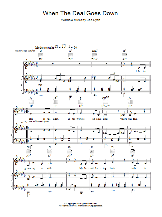 Download or print Bob Dylan When The Deal Goes Down sheet music, chords and digital score arranged for Guitar Chords/Lyrics. This Rock score includes 3 page(s).