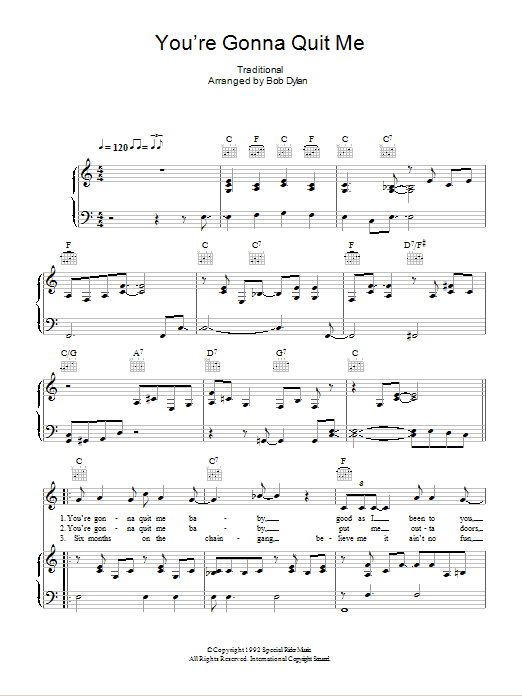 Download or print Bob Dylan You're Gonna Quit Me sheet music, chords and digital score arranged for Piano, Vocal & Guitar Chords. This Folk score includes 4 page(s).