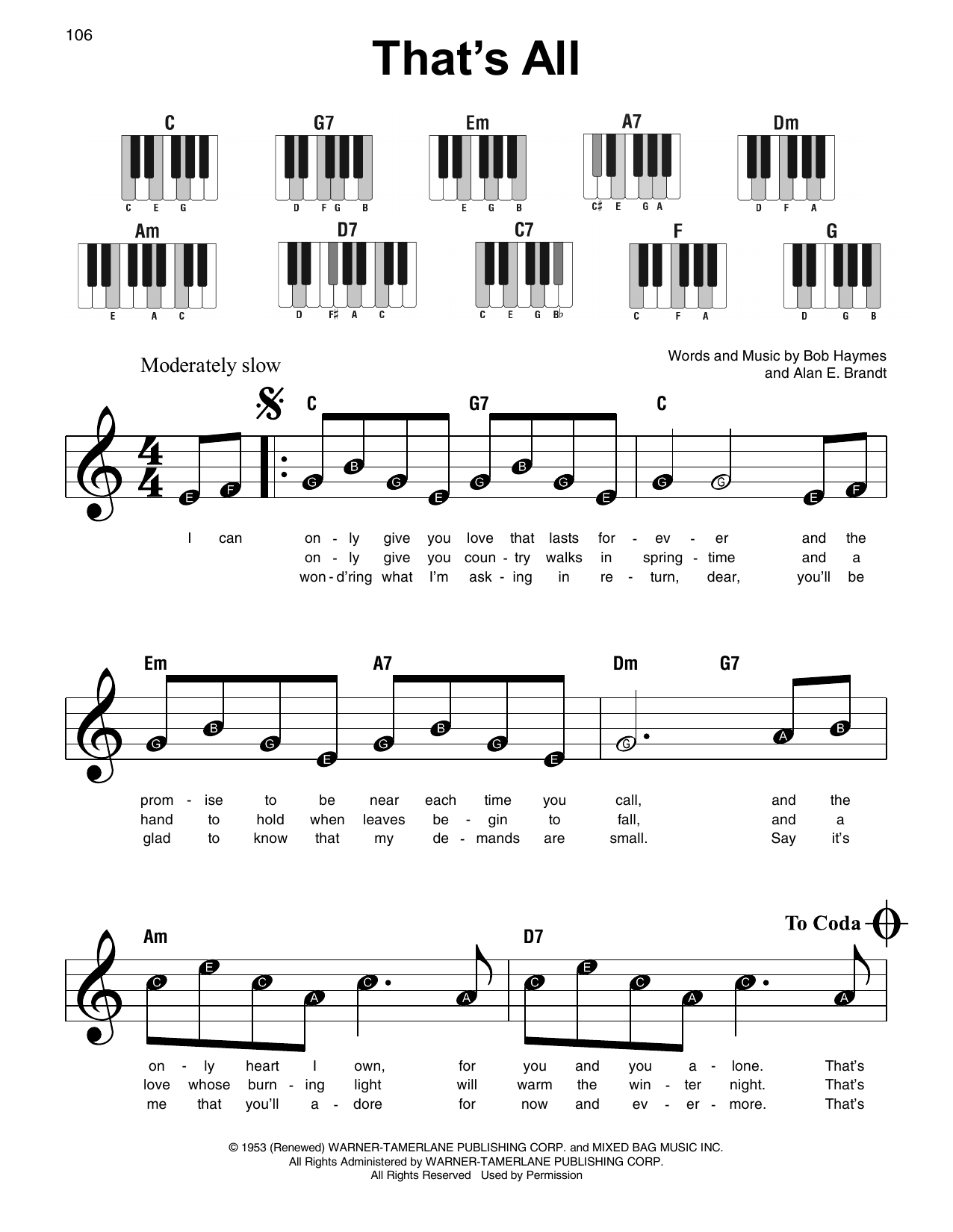 Download or print Bob Haymes That's All sheet music, chords and digital score arranged for Super Easy Piano. This Jazz score includes 2 page(s).