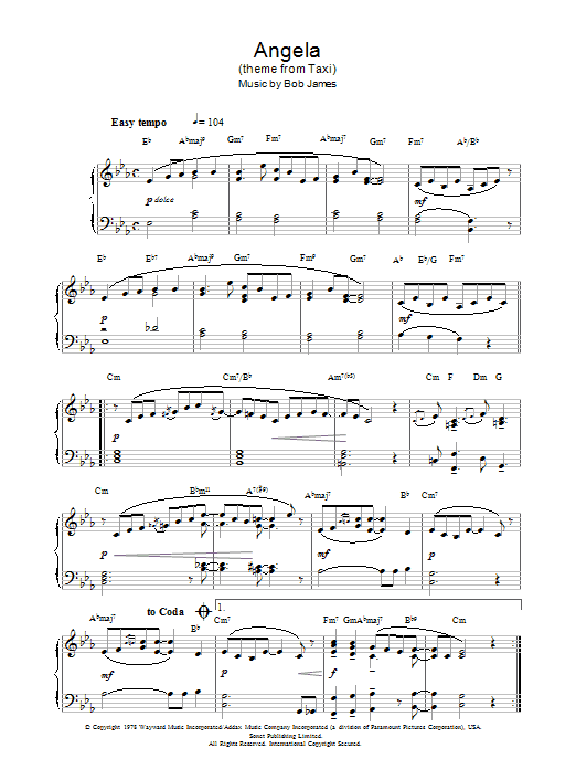 Download or print Bob James Angela sheet music, chords and digital score arranged for Piano Solo. This Film/TV score includes 2 page(s).