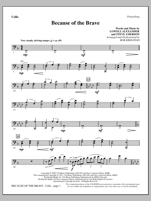 Download or print Bob Krogstad Because Of The Brave - Cello sheet music, chords and digital score arranged for Choir Instrumental Pak. This Patriotic score includes 2 page(s).