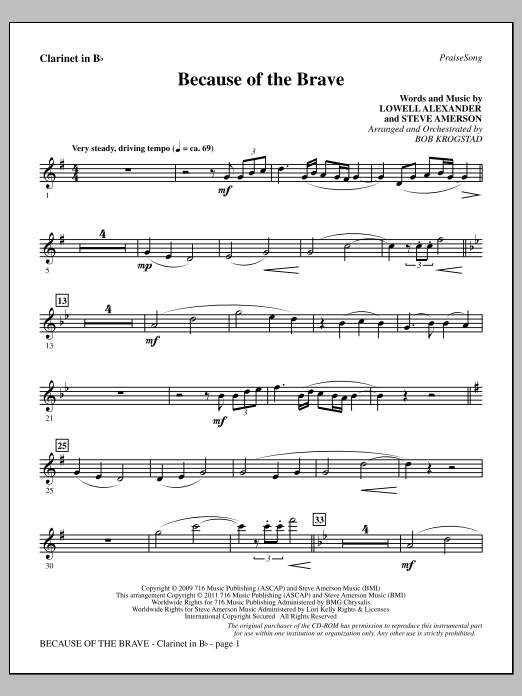 Download or print Bob Krogstad Because Of The Brave - Clarinet sheet music, chords and digital score arranged for Choir Instrumental Pak. This Patriotic score includes 2 page(s).