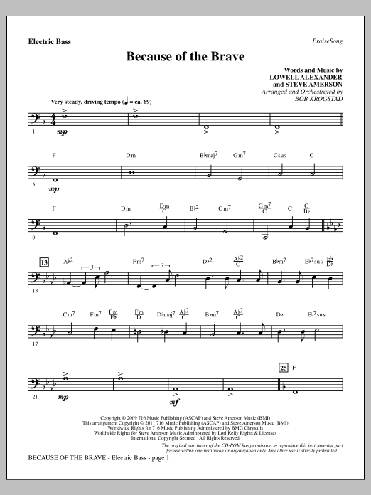 Download or print Bob Krogstad Because Of The Brave - Electric Bass sheet music, chords and digital score arranged for Choir Instrumental Pak. This Patriotic score includes 2 page(s).