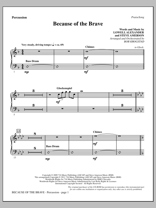 Download or print Bob Krogstad Because Of The Brave - Percussion sheet music, chords and digital score arranged for Choir Instrumental Pak. This Patriotic score includes 2 page(s).