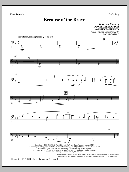 Download or print Bob Krogstad Because Of The Brave - Trombone 3 sheet music, chords and digital score arranged for Choir Instrumental Pak. This Patriotic score includes 2 page(s).