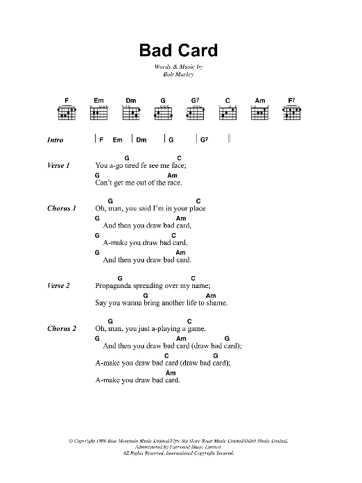 Download or print Bob Marley Bad Card sheet music, chords and digital score arranged for Guitar Chords/Lyrics. This Reggae score includes 2 page(s).