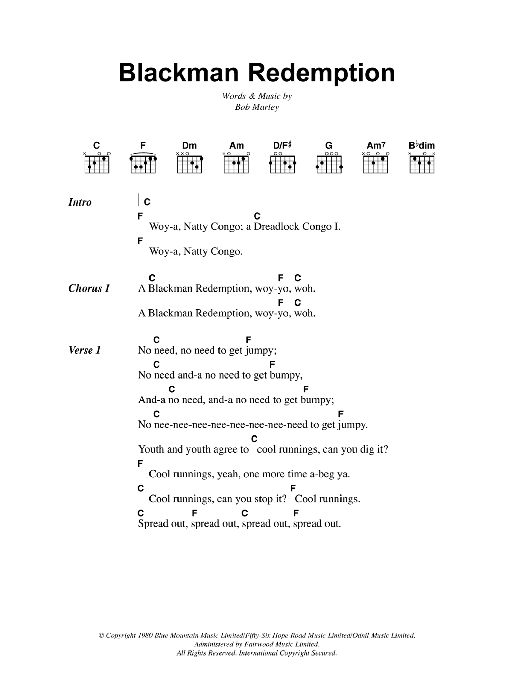 Download or print Bob Marley Blackman Redemption sheet music, chords and digital score arranged for Guitar Chords/Lyrics. This Reggae score includes 2 page(s).
