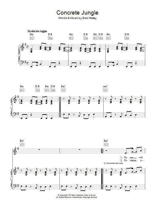 Download or print Bob Marley Concrete Jungle sheet music, chords and digital score arranged for Piano, Vocal & Guitar Chords (Right-Hand Melody). This Reggae score includes 5 page(s).