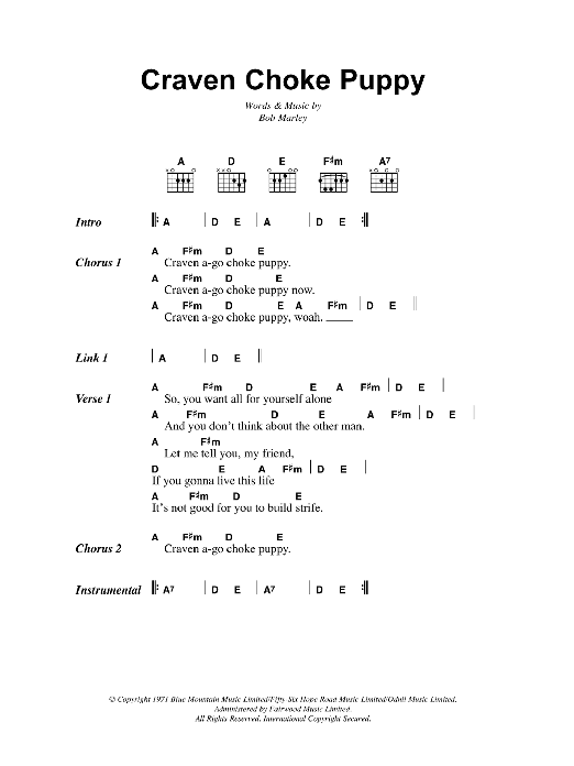 Download or print Bob Marley Craven Choke Puppy sheet music, chords and digital score arranged for Guitar Chords/Lyrics. This Reggae score includes 2 page(s).