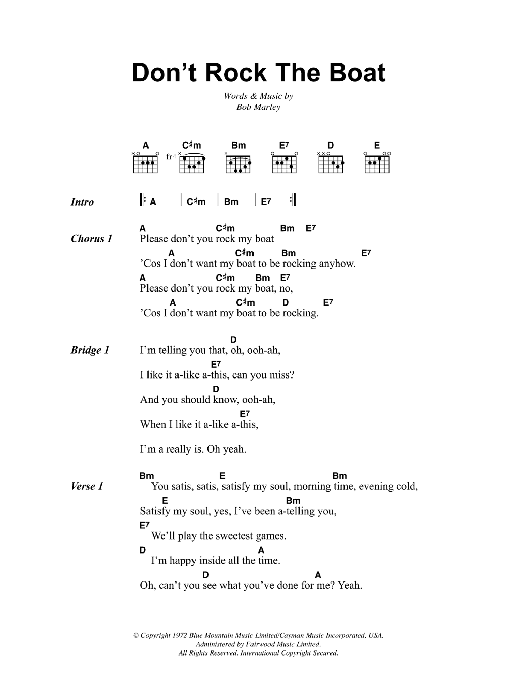 Download or print Bob Marley Don't Rock The Boat sheet music, chords and digital score arranged for Guitar Chords/Lyrics. This Reggae score includes 3 page(s).