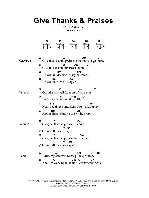 Download or print Bob Marley Give Thanks And Praises sheet music, chords and digital score arranged for Guitar Chords/Lyrics. This Reggae score includes 2 page(s).