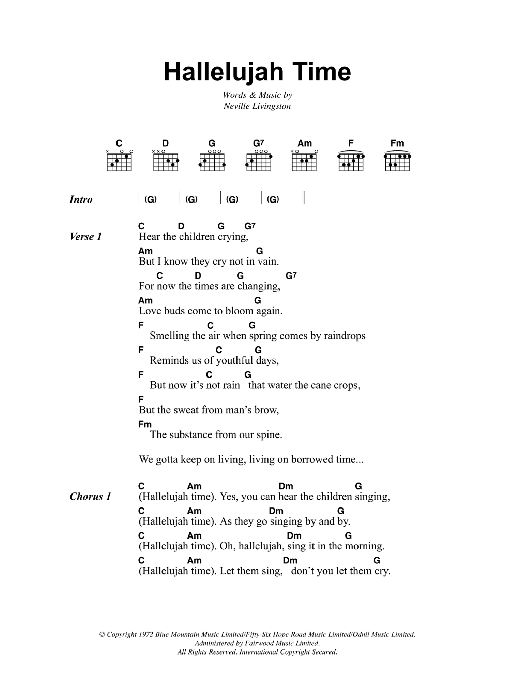 Download or print Bob Marley Hallelujah Time sheet music, chords and digital score arranged for Guitar Chords/Lyrics. This Reggae score includes 2 page(s).