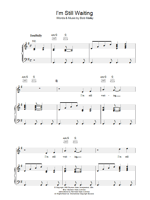 Download or print Bob Marley I'm Still Waiting sheet music, chords and digital score arranged for Guitar Chords/Lyrics. This Reggae score includes 2 page(s).