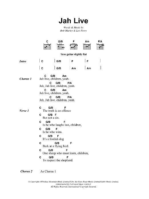 Download or print Bob Marley Jah Live sheet music, chords and digital score arranged for Guitar Chords/Lyrics. This Reggae score includes 2 page(s).
