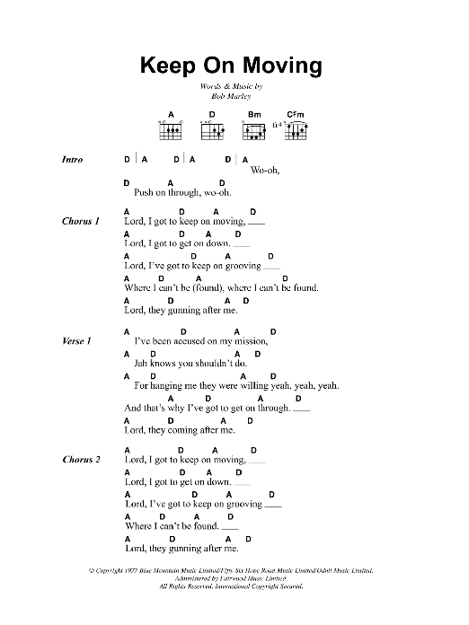 Download or print Bob Marley Keep On Moving sheet music, chords and digital score arranged for Guitar Chords/Lyrics. This Reggae score includes 3 page(s).