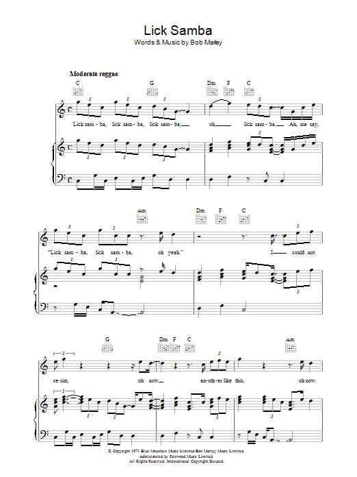 Download or print Bob Marley Lick Samba sheet music, chords and digital score arranged for Piano, Vocal & Guitar Chords (Right-Hand Melody). This Reggae score includes 4 page(s).