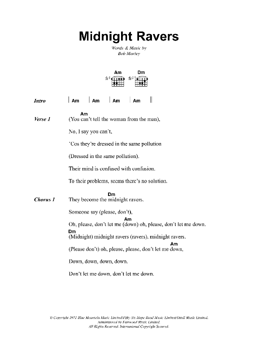 Download or print Bob Marley Midnight Ravers sheet music, chords and digital score arranged for Guitar Chords/Lyrics. This Reggae score includes 3 page(s).