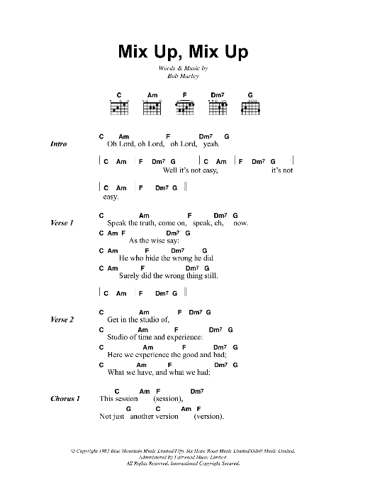 Download or print Bob Marley Mix Up, Mix Up sheet music, chords and digital score arranged for Guitar Chords/Lyrics. This Reggae score includes 3 page(s).