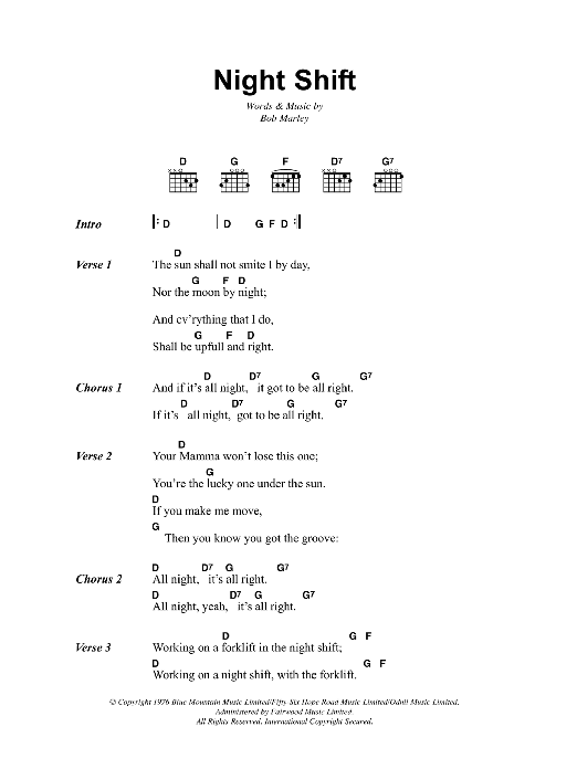 Download or print Bob Marley Night Shift sheet music, chords and digital score arranged for Guitar Chords/Lyrics. This Reggae score includes 2 page(s).