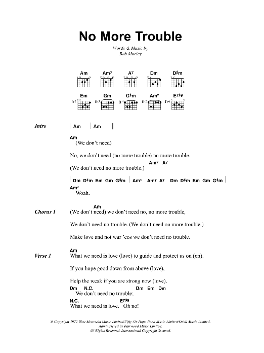 Download or print Bob Marley No More Trouble sheet music, chords and digital score arranged for Guitar Chords/Lyrics. This Reggae score includes 2 page(s).