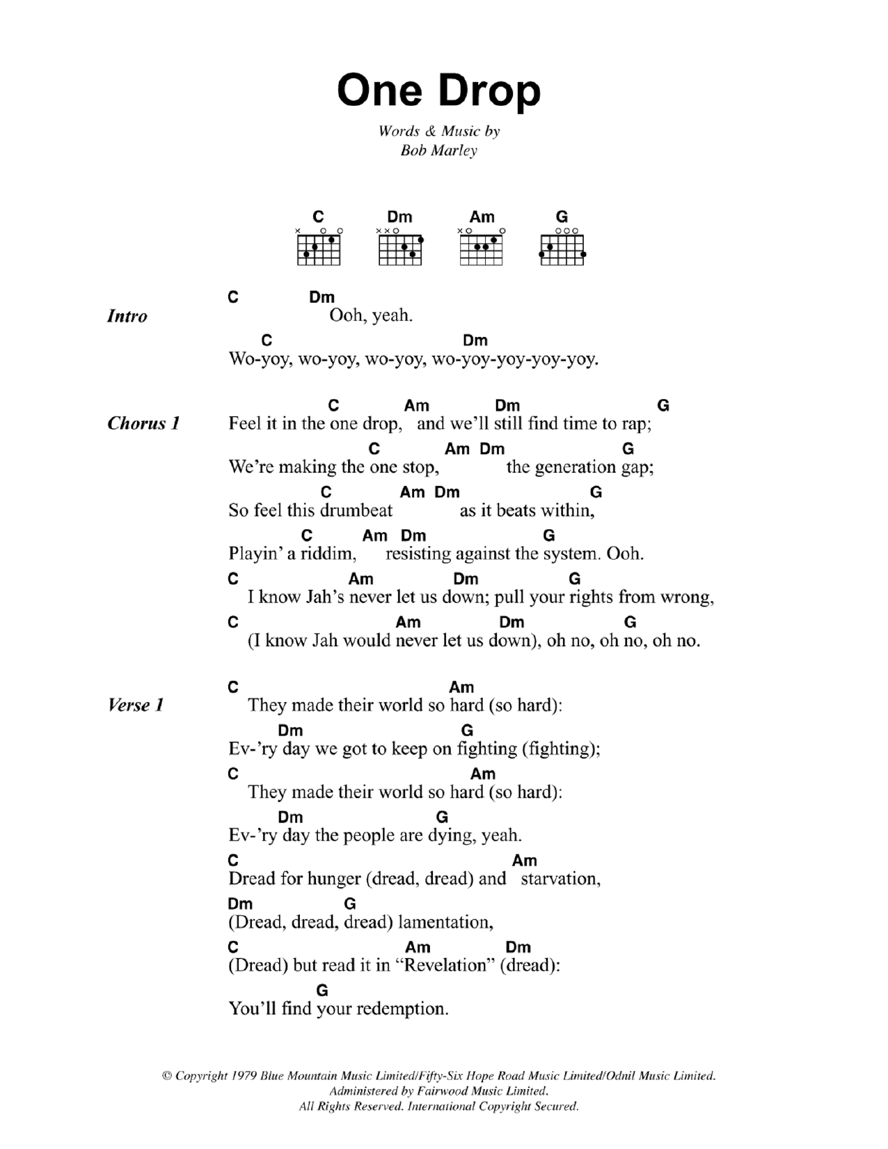 Download or print Bob Marley One Drop sheet music, chords and digital score arranged for Guitar Chords/Lyrics. This Reggae score includes 2 page(s).
