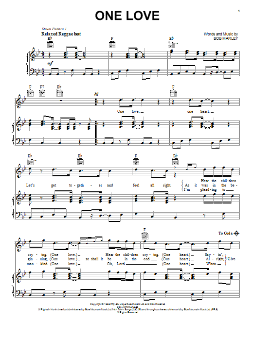 Download or print Bob Marley One Love sheet music, chords and digital score arranged for ChordBuddy. This Pop score includes 2 page(s).