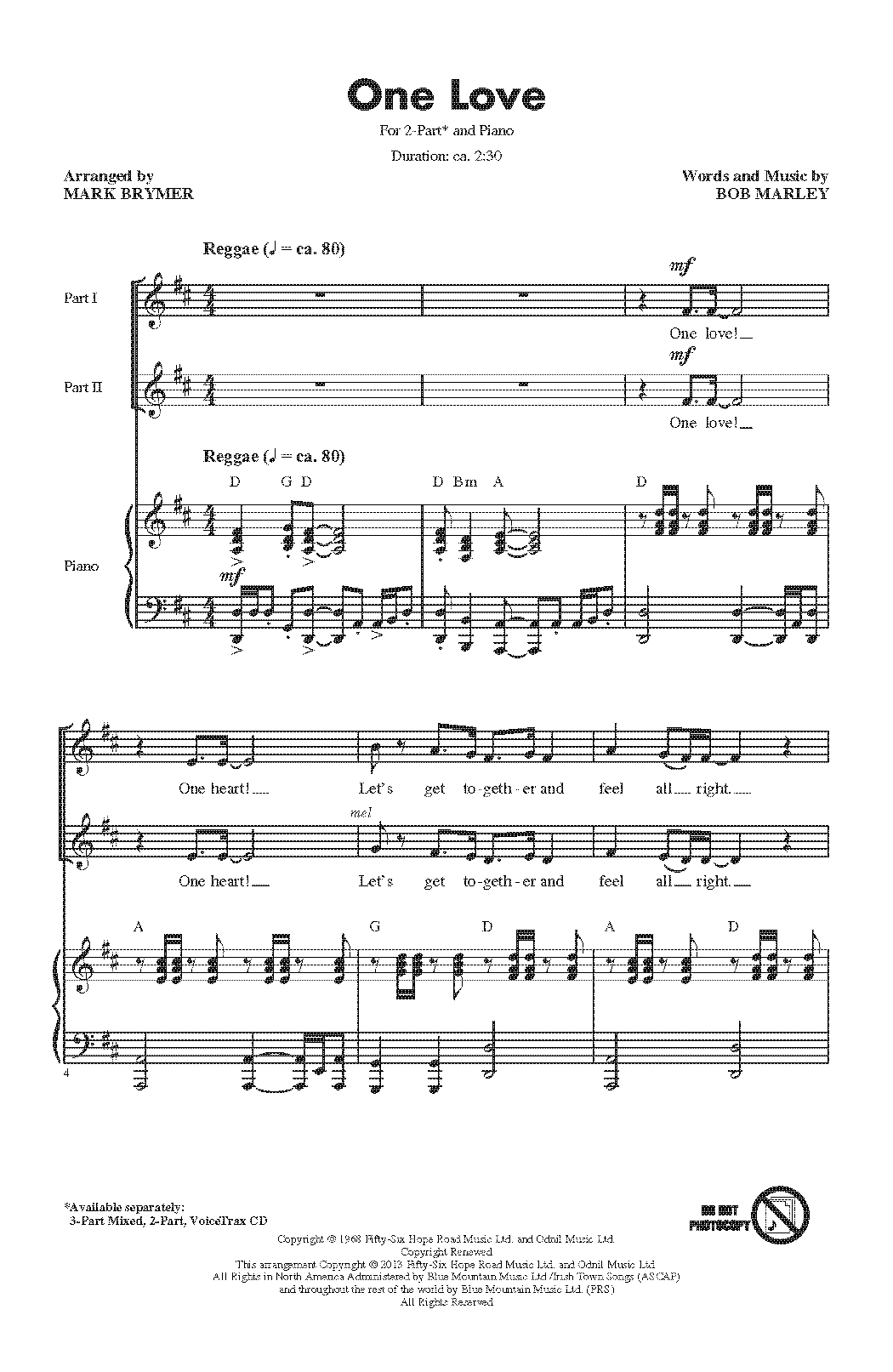 Download or print Bob Marley One Love (arr. Mark Brymer) sheet music, chords and digital score arranged for 3-Part Mixed Choir. This Pop score includes 7 page(s).