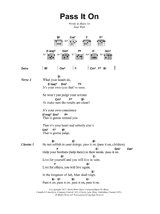 Download or print Bob Marley Pass It On sheet music, chords and digital score arranged for Guitar Chords/Lyrics. This Reggae score includes 2 page(s).