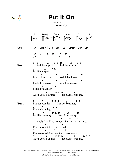 Download or print Bob Marley Put It On sheet music, chords and digital score arranged for Guitar Chords/Lyrics. This Reggae score includes 2 page(s).