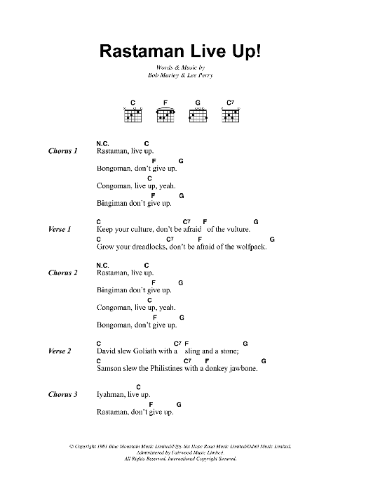 Download or print Bob Marley Rastaman Live Up! sheet music, chords and digital score arranged for Guitar Chords/Lyrics. This Reggae score includes 2 page(s).