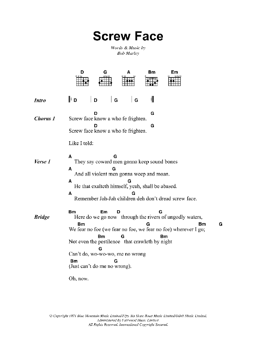 Download or print Bob Marley Screw Face sheet music, chords and digital score arranged for Guitar Chords/Lyrics. This Reggae score includes 2 page(s).