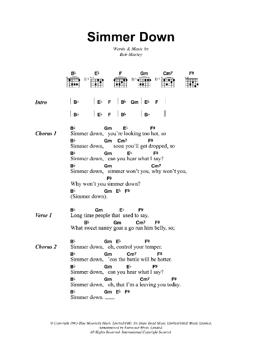 Download or print Bob Marley Simmer Down sheet music, chords and digital score arranged for Guitar Chords/Lyrics. This Reggae score includes 2 page(s).