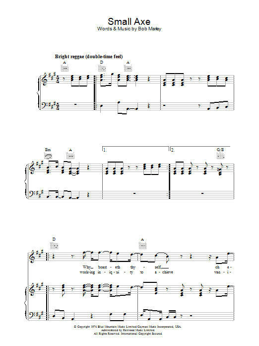 Download or print Bob Marley Small Axe sheet music, chords and digital score arranged for Guitar Chords/Lyrics. This Reggae score includes 2 page(s).