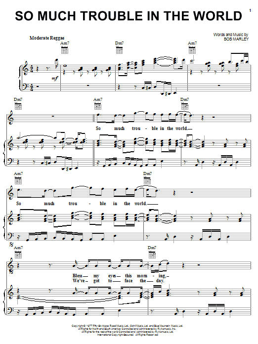 Download or print Bob Marley So Much Trouble In The World sheet music, chords and digital score arranged for Piano, Vocal & Guitar Chords (Right-Hand Melody). This Reggae score includes 5 page(s).