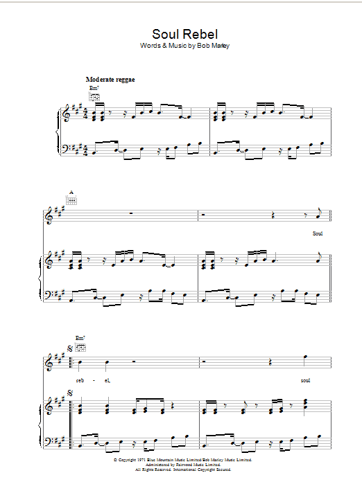 Download or print Bob Marley Soul Rebel sheet music, chords and digital score arranged for Guitar Chords/Lyrics. This Reggae score includes 2 page(s).