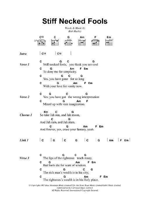 Download or print Bob Marley Stiff Necked Fools sheet music, chords and digital score arranged for Guitar Chords/Lyrics. This Reggae score includes 2 page(s).