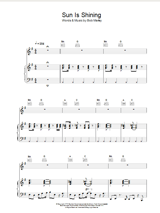 Download or print Bob Marley Sun Is Shining sheet music, chords and digital score arranged for Piano, Vocal & Guitar Chords. This Reggae score includes 4 page(s).
