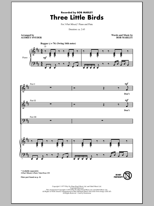Download or print Bob Marley Three Little Birds (arr. Audrey Snyder) sheet music, chords and digital score arranged for 3-Part Mixed Choir. This Pop score includes 15 page(s).
