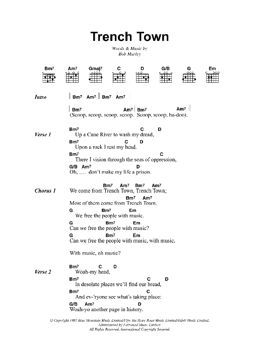 Download or print Bob Marley Trench Town sheet music, chords and digital score arranged for Guitar Chords/Lyrics. This Reggae score includes 2 page(s).