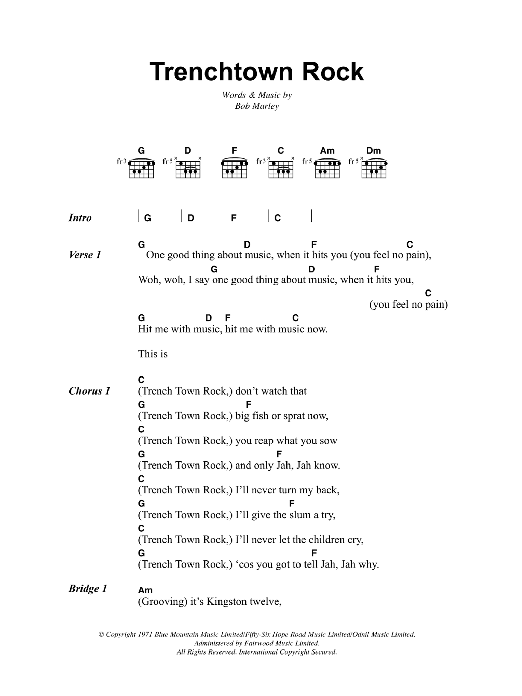 Download or print Bob Marley Trenchtown Rock sheet music, chords and digital score arranged for Guitar Chords/Lyrics. This Reggae score includes 3 page(s).