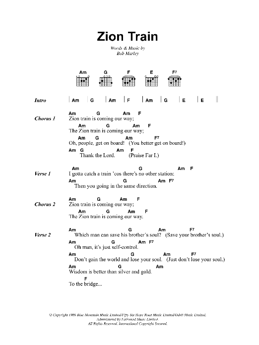 Download or print Bob Marley Zion Train sheet music, chords and digital score arranged for Guitar Chords/Lyrics. This Reggae score includes 2 page(s).