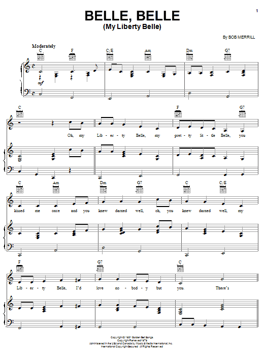 Download or print Bob Merrill Belle, Belle, My Liberty Belle sheet music, chords and digital score arranged for Piano, Vocal & Guitar Chords. This Standards score includes 6 page(s).