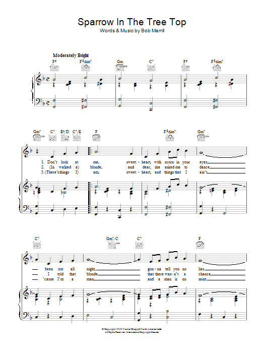 Download or print Bob Merrill Sparrow In The Tree Top sheet music, chords and digital score arranged for Piano, Vocal & Guitar Chords. This Standards score includes 3 page(s).