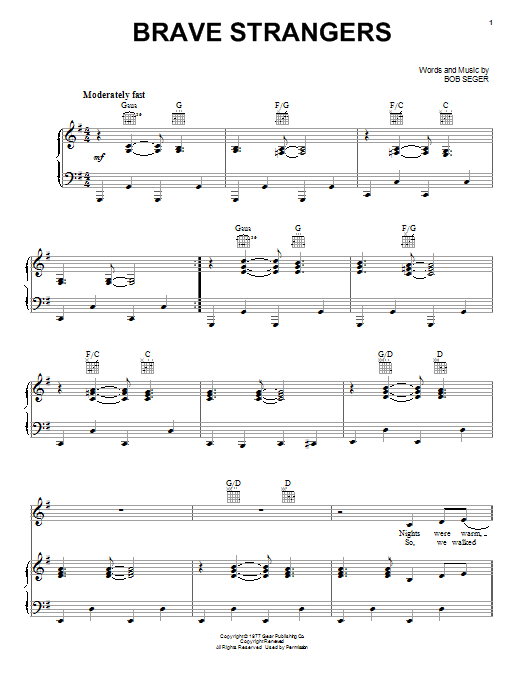 Download or print Bob Seger Brave Strangers sheet music, chords and digital score arranged for Piano, Vocal & Guitar Chords (Right-Hand Melody). This Pop score includes 7 page(s).