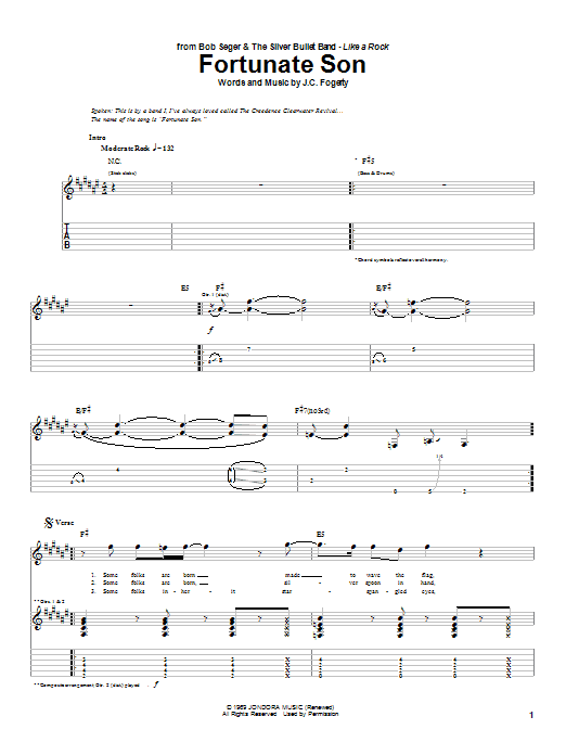 Download or print Bob Seger Fortunate Son sheet music, chords and digital score arranged for Guitar Tab. This Pop score includes 5 page(s).