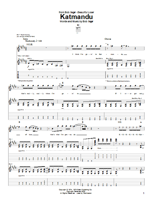 Download or print Bob Seger Katmandu sheet music, chords and digital score arranged for Piano, Vocal & Guitar Chords (Right-Hand Melody). This Rock score includes 9 page(s).