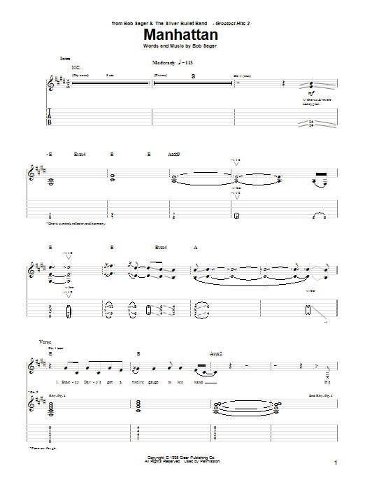 Download or print Bob Seger Manhattan sheet music, chords and digital score arranged for Guitar Tab. This Rock score includes 8 page(s).