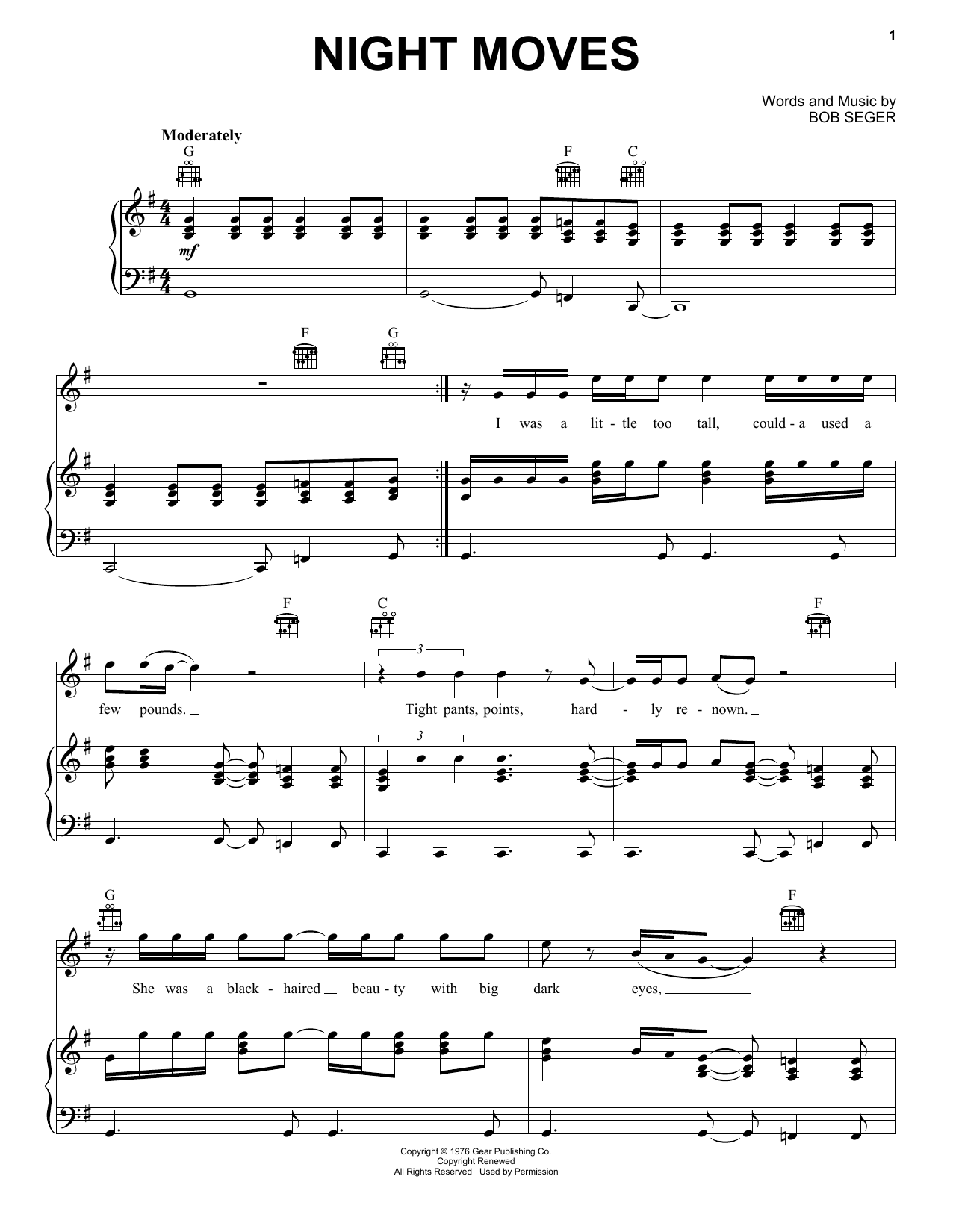 Download or print Bob Seger Night Moves sheet music, chords and digital score arranged for Easy Lead Sheet / Fake Book. This Pop score includes 5 page(s).