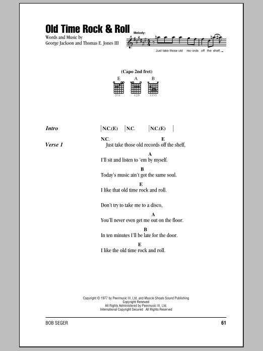 Download or print Bob Seger Old Time Rock & Roll sheet music, chords and digital score arranged for Guitar Tab. This Film/TV score includes 12 page(s).