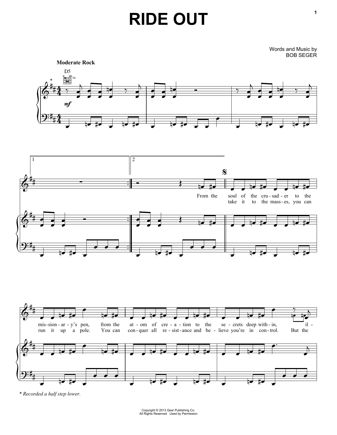 Download or print Bob Seger Ride Out sheet music, chords and digital score arranged for Piano, Vocal & Guitar Chords (Right-Hand Melody). This Pop score includes 6 page(s).